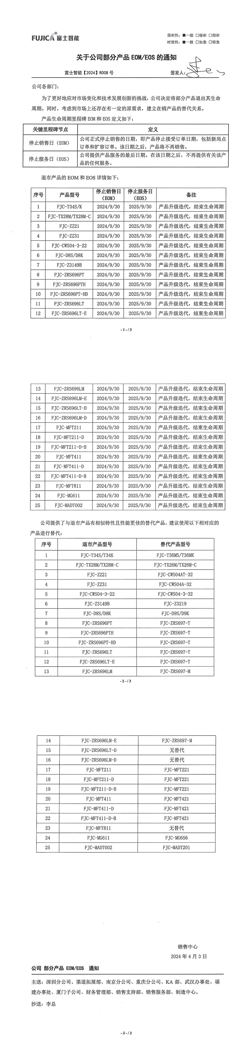關于公司部分產品EOM/EOS的通知