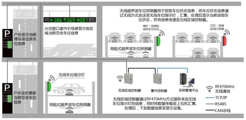 地貼式無線超聲波車位探測器將車位實時狀態信息上傳至無線車位指示燈,無線車位指示燈匯集本組車位的所有狀態信息,并將該組車位信息編碼后上傳至無線區域控制器;同時判斷本組車位中有無空車位,有空車位時顯示綠色,無空車位時顯示紅色。
