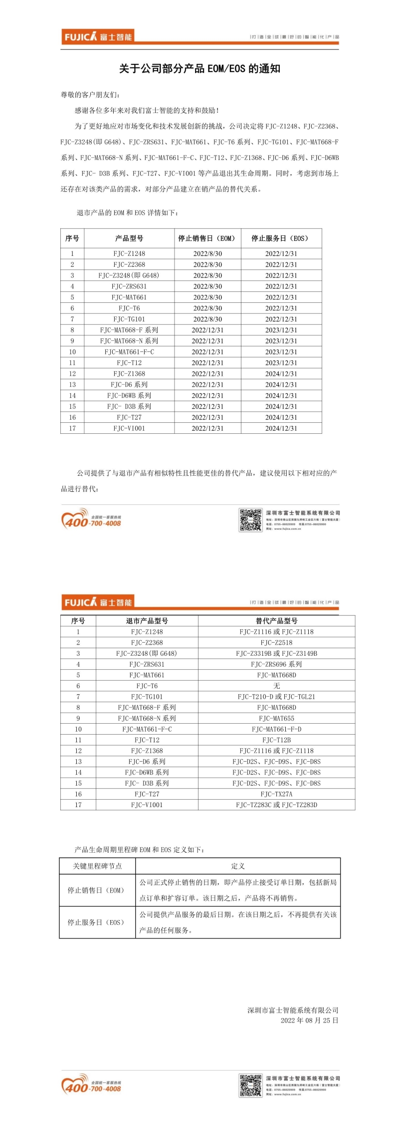 關于公司部分產品EOM/EOS的通知